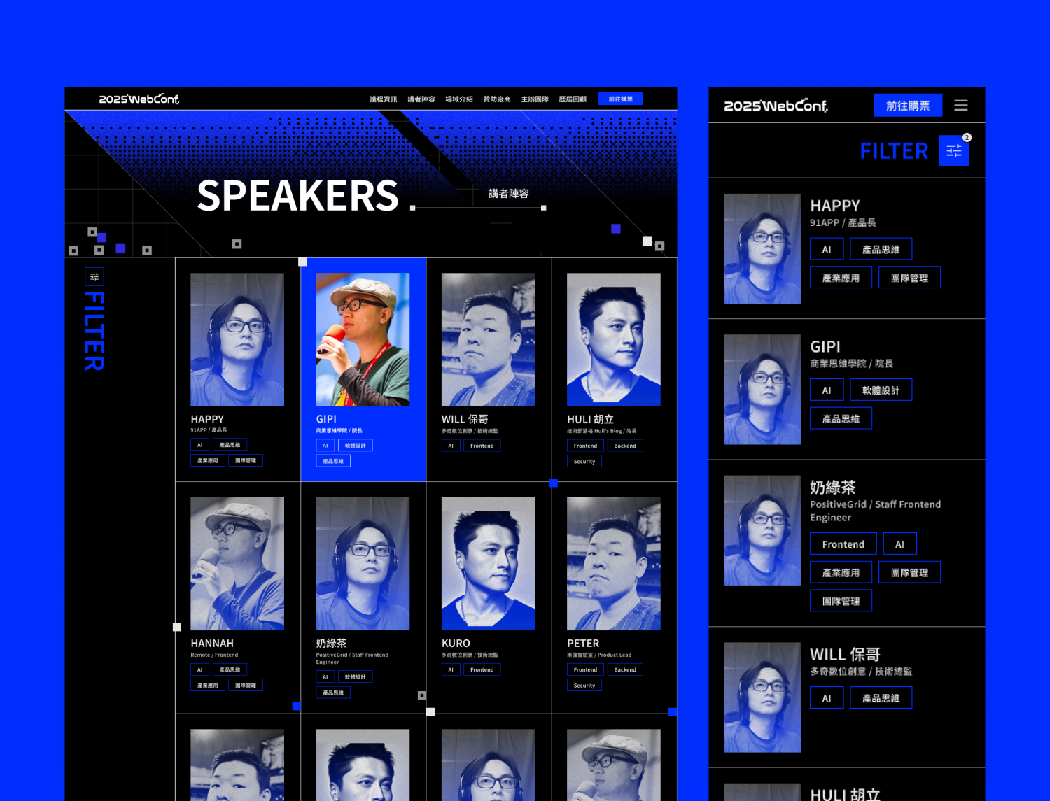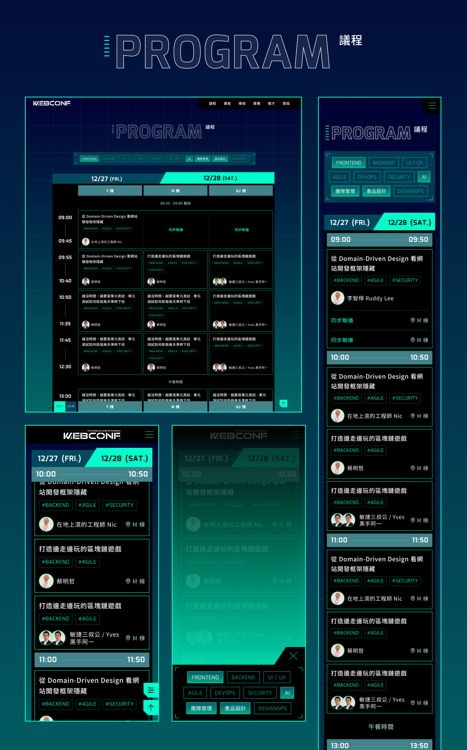 議程頁的設計,須考量三軌場地同時進行、多樣議程主題篩選查看,也需要在活動日當天能快速使用手機閱覽議程資訊,因此在設計上特別注重使用者體驗與介面簡潔性。