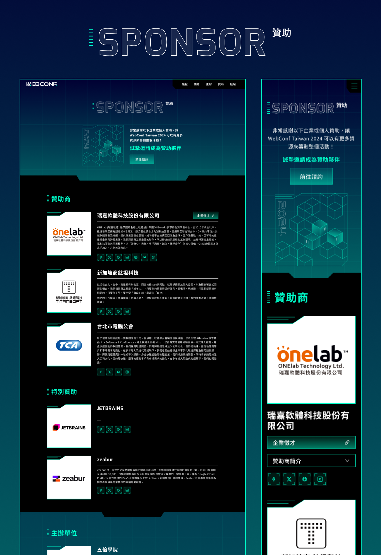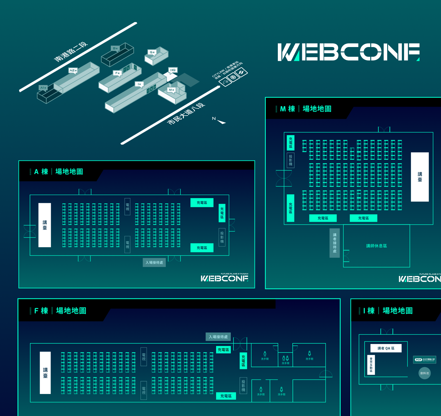 第二年參與 WebConf 研討會設計團隊,以主視覺作為延伸,負責官網議程、贊助頁設計、場地地圖繪製以及整體文本資料統整。